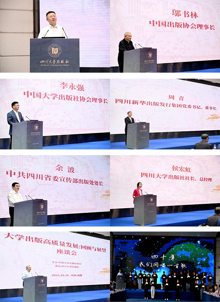 同日,“大学出版高质量发展:回顾与展望”座谈会在四川大学分会场举行。四川大学党委副书记李正赤、中国出版协会理事长邬书林、大学版协理事长李永强、四川新华出版发行集团董事长周青、四川省委宣传部出版处处长余波、四川大学出版社社长侯宏虹等领导出席并致辞。会议回顾了大学出版事业的发展历程与成就,深入交流了数字化转型、国际化传播、学术出版坚守与教育服务创新等方面的实践经验。多位行业领导与出版社负责人围绕新时代大学出版的使命与路径建言献策,进一步凝聚了推动高质量发展的行业共识。会上还举办了“四十年,我们同唱一首歌”亮灯仪式,向包括四川大学出版社在内的39家迎来建社40周年的大学出版社致敬。会议由大学版协副理事长余兴发主持开幕式,四川大学出版社与期刊社党总支书记、出版社董事长庞国伟主持交流研讨环节。