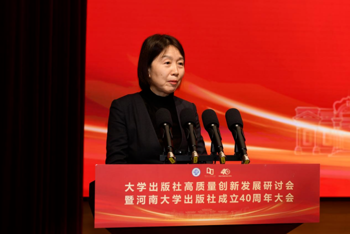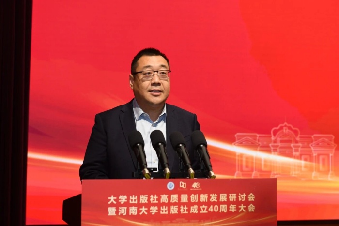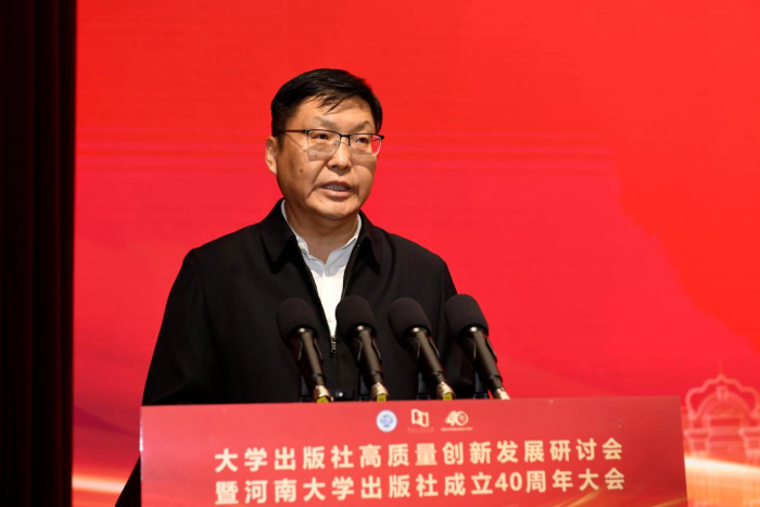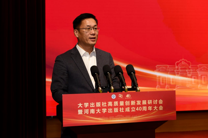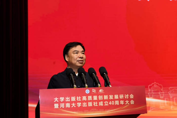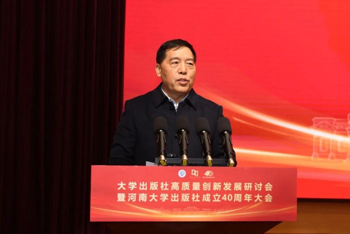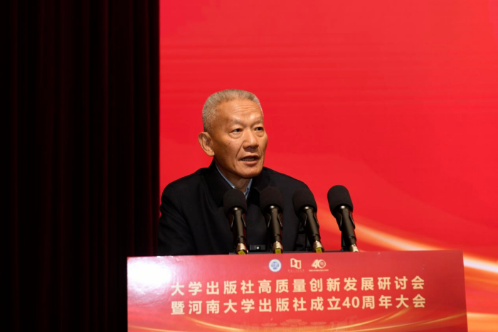 邬书林在致辞中高度肯定河南大学出版社四十年发展成就,他结合出版行业发展趋势提出四点建议:一是提高政治站位,担负新时代文化使命;二是筑牢学术出版根基,服务自主知识体系创新,将高校学科优势转化为出版优势,超前布局前沿领域;三是拥抱人工智能,打造出版新质生产力,构建AI大模型、打造智能场景、探索教育数字化;四是创新人才培养机制,参与出版学科共建工作。
