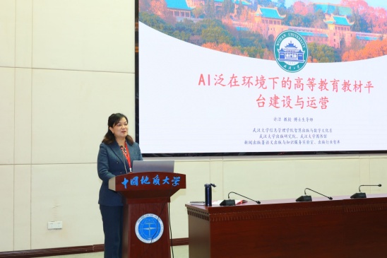 研讨会上,武汉大学信息管理学院许洁教授作了题为《面向泛在AI 环境的高等教育教材平台建设与运营》的报告。报告介绍了当前全球教育科技概况,并结合我国实际,分析了全球视角下的中国数字教育定位和AI泛在环境对高校教学科研的影响。她强调,要将“辅助教学”转化为“重塑教学”,鼓励开放教育资源和教师再创作,构建多平台协同生态,以共赢心态打造可持续发展模式。她表示,数字出版,特别是高等教育数字教材出版的发展,不仅是技术的飞跃,更是重塑人机交互的未来图景,各出版、教育机构要发挥优势,在AI 应用中获得新发展。