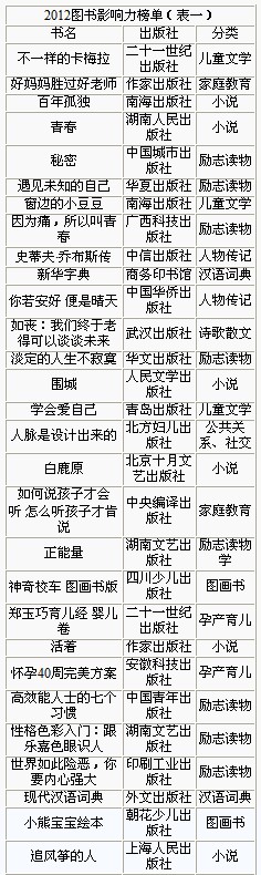 图书排行榜是某一时段内在销图书客观实力的反映,每一本图书的市场表现因上榜名次、上榜时长的差异而不同,畅销书排行榜不仅仅单纯是销量的对比,更是图书市场影响力层面上的体现,因此畅销书排行榜才成为图书营销推广方面的一个重要手段和方式,同时也是读者在选购图书时能够提供参考价值的一项内容。2012年已经结束,本年度图书影响力榜单也已经出炉,通过对全年各月实体书店、网络书店的畅销书排行榜数据进行汇总,并进行处理分析,配合新华书店总店信息中心核心数据库,对本年度图书出版品种情况、选题情况及读者阅读倾向所在等各个方面进行了解。 综合当当网、京东商城网上书店、实体书店的每周排行榜数据,每周前100名图书得分分别记为100分至1分,图书每周在榜的总得分作为排名依据,得出2012年图书影响力排名。可以看到,排名前50位的各本图书,无论是在榜时长还是综合得分均处于前列,市场影响力占据绝对优势。 从2012年图书影响力排名top50中可以看到,整个榜单中超级畅销书依旧尚未凸显,排名前两位的依旧是近几年持续畅销的旧作。在分类方面,本年度畅销书类别仍然主要集中于文学类、经管类及励志类三大类中。其中文学类图书占据15个名额,儿童文学类图书占6本,经管类图书也占到5本,而2012年励志类图书有15本进入前50位的排名之中,成为今年表现非常突出的一个分类。其他类别中,教育类、生活类也都分别有作品进入影响力排名前50位之中。从整体上来看,大众读者的阅读趋向依旧偏重于娱乐化、浅阅读,畅销书中很难出现纯文学作品。在国别分布方面,影响力前50位的图书中,有21本为引进版图书作品,占比接近一半,而从排名先后上来看,引进版图书也占据绝对优势,市场影响力高于本土图书作品。 《不一样的卡梅拉》和《好妈妈胜过好老师》均为近几年持续畅销的作品,自出版以来便持续热销,活跃在各类排行榜单之上。其中《不一样的卡梅拉》在众多儿童文学作品中可谓一枝独秀,书中充满童真和童趣,想象力极其丰富,看后又能引发儿童的思考和回味,因此颇受儿童读者喜爱,也是家长必购的一套童书,目前全套已出版11本。而《好妈妈胜过好老师》从2009年至今销量经久不衰,已经成为家庭教育图书中的典范作品,也带动了此题材成为图书市场中的热点,品牌效应十分凸显。从两本图书在本年度榜单上的表现来看,经典作品的市场影响力不容小觑,在缺乏超级畅销书的现今,作品的内容质量已成为图书能否畅销的重要因素。 排名第三位的《百年孤独》,经过一年的市场累积,较去年榜单再次提升一个位次,足见该书以及作者加西亚·马尔克斯在中国读者中的名气以及影响力。而南海出版社也正是看重了这一点,在2012年9月又再次引进马尔克斯的另一部经典作品——《霍乱时期的爱情》,从全年总体成绩来看,该书推出3个月便已经位列年度影响力榜单第53位,再度赢得读者好评,可以预期《霍乱时期的爱情》在未来几年依旧会在书业市场和读者中具有持久性的影响力。 如果说加西亚·马尔克斯是国外作家中的“吸金”高手,那国内便不能不提到韩寒、郭敬明和南派三叔三位作家富豪榜上的常客,韩寒2011年的新作《青春》一书依旧跻身影响力榜单前5位之中,颇具持久力。但韩寒的另一部手稿集《光明与磊落》就很难有如此成绩,仅在出版后在榜两周时间,便销声匿迹,毕竟并非新作,而是《三重门》的手稿集合成册,炒作大于内容本身,因此销售乏力也可以理解。另一位“80后”作者郭敬明2012年未有新作推出,“小时代”系列在终结后销售情况也略显乏力,只维持3个月便离开畅销榜单,作为青春文学作品,由于面向读者的局限性,对于市场的掌控力也不够强大。南派三叔2012年8月推出新作《藏海花》,内容可以称为“闷油瓶”外传,故事围绕《盗墓笔记》中“闷油瓶”过去和现在的经历展开,一经上市也吸引了大批“盗墓”的读者追随,但市场影响力未能达到《盗墓笔记》所创造的辉煌成绩。究其原因,也许书迷们都已经足够聪明,既然本就知道《藏海花》又是三叔挖下的一个大坑,所以静待全部出炉之后再入手也绝对不迟。目前《藏海花2》正在杂志《超好看》上进行连载,另一位主人公吴邪的外传据传也在酝酿之中,可见“盗墓风潮”还远没有结束,凭借《盗墓笔记》所积累下的强大人气,《藏海花》能否成为超级畅销书值得期待。 《你若安好 便是晴天》也是从2011年火到了2012年,书名也都演变为了网络流行语,不同于一般的人物传记,《你若安好 便是晴天》一书不仅仅是林徽因的生平记述,而是用类似于诗词的手法写得很美,因此在一众传记类图书中脱颖而出。(见表一)