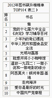 在图书影响力榜单之外,有不少图书作品也曾经取得过突出成绩,这些图书由于上榜时间较短或是年末刚刚出版,因此无缘进入影响力榜单之中,但上榜平均得分十分之高,可以说在短期内颇具影响力。其中,排名首位的为作家莫言的长篇小说《蛙》,2012年诺贝尔文学奖于10月11日揭晓,而莫言便是凭借作品《蛙》获得诺贝尔文学奖,也开创了我国文学界的先河。在此之后,上海文艺出版社出版的《蛙》连续上榜7周,也均排名首位,成为图书飙升榜首位图书作品。无论各界媒体如何评论,但获奖绝对是好事,而诺贝尔文学奖对于图书市场的带动作用也十分明显。 《少年Pi的奇幻漂流》位列图书飙升榜第三位,读者对图书的了解主要来源于李安导演2012年的同名电影新作,事实上《少年Pi的奇幻漂流》的小说原著早在2005年便已经出版,是一部关于成长、冒险、希望等多方面内容的经典小说,在美国、加拿大、德国、英国等国家都进入了高中生必读书目之中,但在中国并未得到关注。而随着李安的电影作品在全球上映,《少年Pi的奇幻漂流》也被译林出版社引进出版中文版小说,在年末上市销售,周均排名均在前三位之中,不少读者表示原著作品远比电影剧情更加动人,但其能够赢得市场恐怕必须要归功于李安导演及电影本身的市场影响力。 同样,作家刘震云的《温故一九四二:一部小说和一部电影的缘分》也出现在图书飙升榜的第七位。《温故一九四二》本是作家刘震云在1993年发表的纪实文学作品,讲述1942年中原旱灾,灾民集体逃荒的整个过程。2012年历经19年的反复打磨改编为电影剧本,由冯小刚导演的电影《一九四二》于12月上映,随即引发观影热潮和影迷的热议,而《温故一九四二:一部小说和一部电影的缘分》一书便是电影剧本的完整版本,较之前的纪实文学更加直观化,更包括部分电影中被删掉的章节,因此不少影迷也都纷纷进行购买。在12月上市之后,该书便均排名单周前十位,仍有一定上浮空间。 中国共产党第十八次全国代表大会于2012年11月召开,而《中国共产党第十八次全国代表大会修订通过的新的中国共产党章程单行本:中国共产党章程》也在11月迅速推出,由中央有关部门党章研究专家编写,以问答形式简明交代了十八大党章的新修订、新特点、新意义,同时结合当前新的国内外局势,就党在纲领、制度、组织、纪律和干部等方面的应对作了说明。作为学习十八大党章的重要辅助读物,此书上架销售成绩十分突出,出版后每周均排名前十位之中。同时,食品安全成为近两年来最受重视的话题的当下,《中华人民共和国食品安全法》也成为热销读物,一度排名畅销榜单的首位。 借由图书飙升榜不难看出,图书销量的高峰往往需要“突发事件”的引导,例如改编电影的上映、图书获奖或是相关新闻的出现,都有可能导致图书销售成绩的飙升,短时间颇具市场影响力。但若想进入图书影响力榜单,恐怕仍然需要内容上的反复推敲和作者、题材等多方面的影响效应。(见表二)