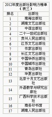 与图书影响力相同,出版社所出版图书在排行榜上的销售成绩,也可以反映出出版社的品牌影响力,综合各畅销书所得分数,能够得到每本图书在榜上的销售情况,通过对其进行的汇总分析,从而能够得到出版社在出版方面的畅销排名,作为出版社品牌影响力的榜单。 对比2011年同期榜单,2012年出版社影响力榜单首位易主,从中信出版社变为南海出版社,由于2012年没有出现像《史蒂夫·乔布斯传》般搅动图书市场的轰动之作,因此中信出版社只能将头名拱手让人,而降落至第三位。登上榜首位置的南海出版公司共有20本图书上榜,数量并不多,但凭借《窗边的小豆豆》《百年孤独》两本图书的强大影响力,也足以超越其他出版社。此外,南海出版社上榜图书基本均为引进版作品,类别集中于文学类、少儿类,其中不乏《西尔斯亲密育儿百科》等一批畅销图书,2012年的新书并不多,但《霍乱时期的爱情》实力不容小视。 排名第二位的为湖南文艺出版社,较上年同样上升一个位次,全年共有31本图书上榜,图书影响力排名前50位中占到4个位置。其中畅销书《遇见未知的自己》作者张德芬,2011年和2012年的两部系列作品均在湖南文艺出版社出版,分别为《重遇未知的自己》和《遇见心想事成的自己》,也是该社最受欢迎的畅销书。同时,湖南文艺出版社的不少励志类图书,例如《正能量》《跟乐嘉色眼识人》等也都是本年度颇受读者喜爱的励志读物。依靠文学类、励志类两类畅销图书类别,湖南文艺出版社的品牌本身已经成为一种质量的保障。(见表三)