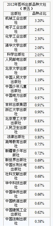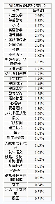 图书出版品种一向是反映出版行业规模与活跃程度的重要指标,阅读行为调查中心2012年度也借助于新华书店总店信息中心书目成品数据库,对2012年全国图书出版信息进行监测,以期掌握全行业图书出版的品种规模趋势和选题走向,为各出版社的出版方向、选题策划提供参考。2012年全国出版图书可供品种总量达到121480种,其中引进版13640种。 在出版社情况方面,品种过千大社占到14家,较去年同比有明显提升,品种规模达到500种以上的出版社也占到52家。从排名情况上可以看到,机械工业出版社仍然稳居品种大社首位,占比达到3.20%,但较2011年同期比重有所下降,与其他出版社之间的差距正在逐步缩小。排名2~5位的四家出版社,均为教材品种大社,占比均超过2%。前五位的出版社品种集中度达到12.28%,集中度也逐渐下降,垄断趋势有所减弱,从各社之间的差距来看,也正在逐步缩小,竞争颇为激烈。在2012年出版品种选题方向上,品种过千的图书类别占到33种,品种集中度达到57.07%,可见2012年度图书出版选题比较集中。对比图书影响力榜单情况,不难发现2012年出版图书分类也集中于目前市场上受到读者青睐的儿童文学、小说、外国文学、传记等,可见出版社十分重视迎合市场和读者阅读趋势等方面。 在各细分类方面,儿童文学类2012年出版品种最为丰富,占比达到5.66%,核心出版社包括二十一世纪出版社、湖北少儿出版社、浙江少儿出版社等。第二位的为学前教育类,也是近几年市场上颇受关注的一类题材,占比为3.82%,像中国人口出版社、吉林美术出版社等在此类别中品种规模占比具有一定优势。而在小说类图书中,江苏文艺出版社毫无悬念占据领先位置,而新世界出版社近几年出版不少网络小说,其中包括不少知名的网络写手,像匪我思存、明晓溪等,因此无论是在小说的品种上还是销量上,都取得了突出的成绩,受到读者的青睐,市场影响力也逐步提升。 此外,像漫画类、传记类、企业经济类、心理学类在品种规模占比方面都有较为明显的提升,也是近两年市场上热销的图书题材,值得出版社进行重点关注。 (见表四、表五)
