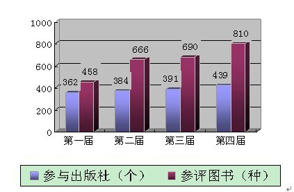 中华优秀出版物奖评奖开展四届,不但出版单位重视程度提高,参评作品数量也在不断增加。据统计,第一届评选,全国共有362家出版单位报送参评图书458种;第二届评选,全国共有384家出版社报送参评图书666种;第三届评选,全国共有391家出版社报送参评图书690种;第四届评选,全国共有439家出版社报送参评图书810种。(见图1)