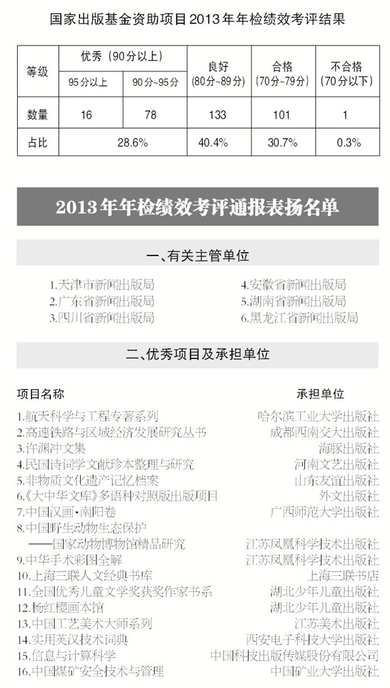 经国家出版基金管理委员会批准,现对管理工作卓有成效的天津市新闻出版局等6个主管部门、考评“优秀”且得分在95分以上的《航天科学与工程专著系列》等16个项目的14家承担单位提出通报表扬。对1个年检考评不合格,以及延期在3年(含)以上的项目承担单位提出通报批评,并取消有关单位2014年度申报国家出版基金项目的资格。对23个申请延期1年以上的项目承担单位各扣减1个2014年度申报新项目数量。