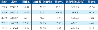 2012年报纸出版总印张为2211亿印张,同比下降2.68%,折合用纸量为508.53万吨,比上年减少14.03万吨。当年报纸出版品种为1918种,比上年减少10种,报纸品种减少在近5年中已是第3次(见表4),只是前两次品种减少,并未导致总印张下降。而2012年与品种下降相伴的是总印张下降。