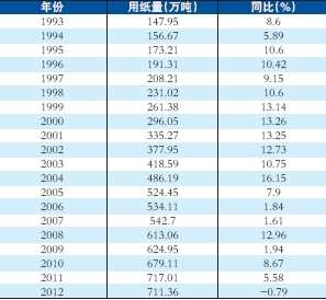 2012年,中国出版业一个与往年不同的特别变化是:标志全国纸介质出版产业规模的图书、期刊、报纸年用纸量711.36万吨,比上年下降了0.79%,虽然这一出版用纸量只是比上年减少不足6万吨,降幅不足1%,但这却是自上世纪90年代以来,20多年间首次出现的同比下降(见表3)。