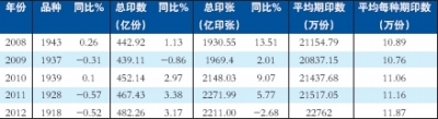 报纸作为纸介质出版中出版规模最大(总印数、总印张分别居首)、营业收入最高的部类,近几年的发展优于图书和期刊。而其作为短媒,比之中媒期刊、长媒图书,又是更多受到新兴的移动传媒、快捷阅读的直接冲击,更多地与它们短兵相接;加之非时政类报纸出版改革带来的品种减少,报业处在外部冲击日甚、内部收缩限时的双重“挤压”之下。在这样的境遇中,2012年报纸出版虽品种减少,但总印数却增长3.17%。其增幅高于当年品种均告增长的两大“盟友”图书的总印数增幅和期刊的总印数增幅,这的确是难能可贵的。特别是这一品种下降、总印数增长还连带生成了考量连续性出版物的两项重要指标——平均期印数和平均每种期印数的增长:平均期印数2.28亿份,同比增长5.79%,平均每种期印数11.87万份,同比增长6.34%。