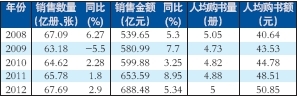 2012年销售数量和销售金额的增长,还使当年的全国人均购书跨上“新阶”。按国家统计局公布的2012年末全国人口数量计算,当年全国人均购书量为5册,人均购书额为50.85元,二者不但均比上年增长,还分别跨上5册和50元“新阶”(见表6)。