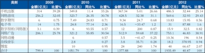 尽管逾4成的高速增长,使数字出版的营收规模超过了纸介质出版,但剖析其营收构成可见:数字出版的9大部类营收全面增长,增幅最大的是以休闲功能为主的在线音乐和网络动漫:前者营收从3.8亿元增至18.2亿元,增长近4倍,增幅达378.95%;后者营收从3.5亿元增至10.36亿元,增长近2倍,增幅达196%。占据数字出版营收大部,堪为营收主体的仍是网络广告和网络游戏两大部类,二者所占营收份额达68.34%,几近7成,比上年增长0.02个百分点。真正对纸介质出版产生替代作用的电子书、数字期刊、数字报纸虽然营收整体增长达52.56%(电子书增长87.88%、数字报纸增长32.5%、数字期刊增长15.95%),但毕竟总量尚小,三者所占营收份额总计仅为2.98%(见表7)。手机出版中虽然有手机阅读的内容,但份额尚小,手机音乐、手机游戏占去大部。
