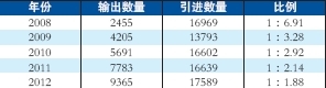 2012年中国出版业的对外版权贸易也实现了逆差缩小:全国共输出版权9365种,同比增长20.3%;共引进版权17589种,同比增长5.7%。版权输出与版权引进的比例为1︰1.88,比上年的1︰2.14逆差缩小(见表8)。
