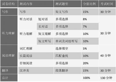 调整后,原来的听写变成全部考查单词短语;快速阅读变成段落信息匹配题;翻译扩充至150~200字的整段中译英;不再考查完形填空。