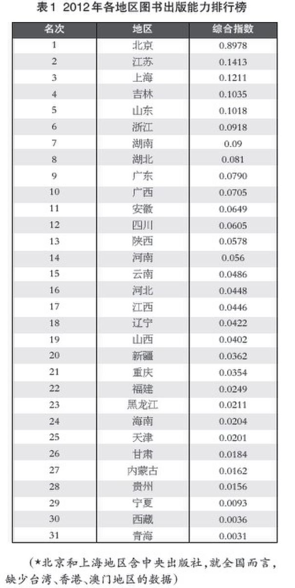 我们对各地区的图书出版能力依照LM指数进行了排名,基本勾勒出我国图书出版能力的地域分布(见表1)。