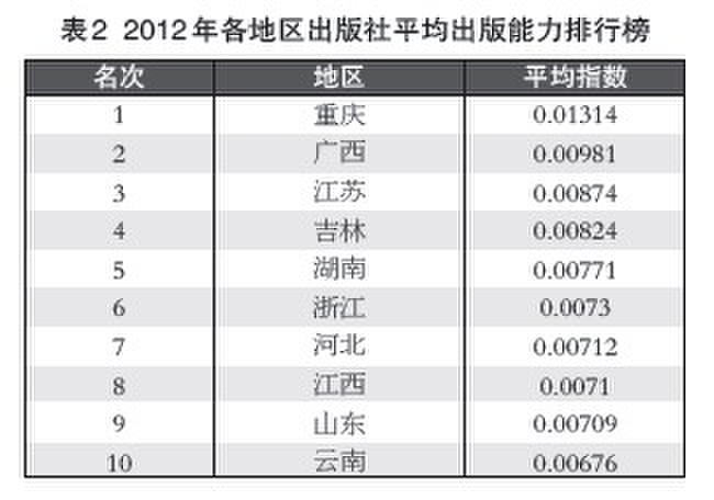 一个地区的图书出版能力取决于两个因素:第一,出版社的数量;第二,出版社平均的出版能力。就出版社的数量而言,北京第一,上海第二,广东第三。就出版社平均的出版能力而言,重庆、广西、江苏地区出版社的出版能力连续列前三甲(见表2)。