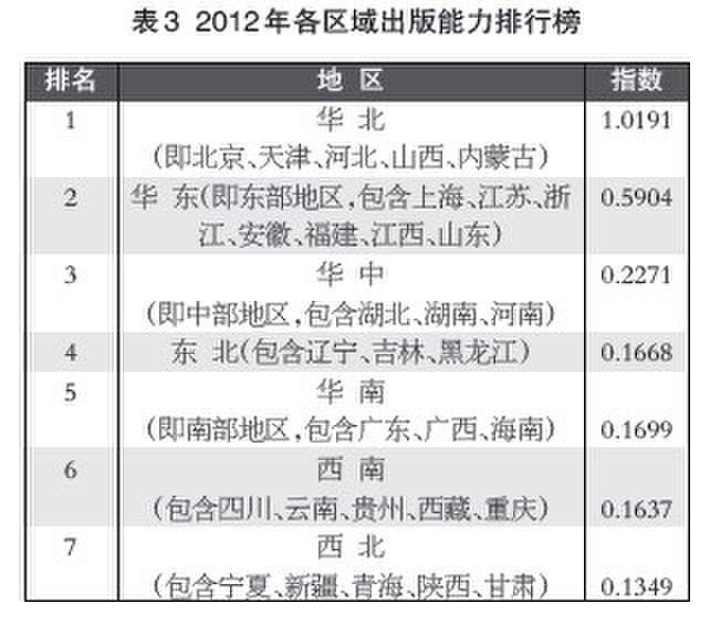 寻求区域联合、打造区域经济,历来是产业发展的基本路径,也是产业成熟的必然表现。党的十七届三中全会以来,党和国家鲜明地把文化强国作为国家战略的重要内容。出版业不但要做文化体制改革的“排头兵”,更要做建设文化强国的“排头兵”,通过调整区域布局、深化区域合作,是做大做强出版产业的题中应有之义。按照七大经济区域划分,我们对区域出版力量进行了出版能力排名(见表3)。