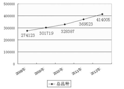 近20年来,全国图书出版品种总数正在加速度上升,从1994年的10万种到2004年的20万种,历经10年;2004年的20万种到2009年的30万种,历经5年;2009年的30万种到2012年的40万种,仅历经3年。从增幅来看,近5年,全国图书品种以平均每年10%的速度增长,近两年的增幅均超过12%。