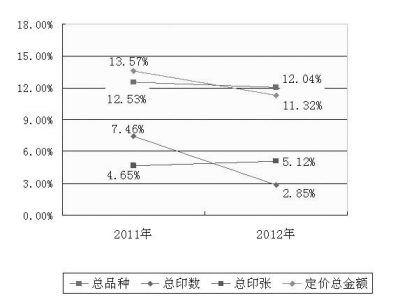从增长率来看,衡量全国图书出版规模的几个指标中,2012年,虽然总品种、总印数、总印张和定价总金额都保持着增长,但是相对于2011年的增长率变化则各有不同。除了总印张、总品种的增长率小幅增加或基本持平外,总印数、定价总金额这两个指标的增长率均有所下降,总印张的增长率下降幅度较大,2011年总印张同比增长了7.46%,而2012年的这一数值为2.85%(见图3)。