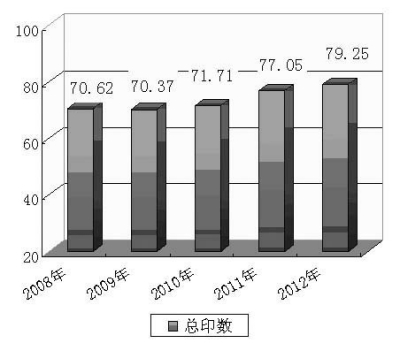 2008~2010年,我国图书总印数大约在70亿册(张)左右,可以说这一数据形成了当时图书消费的基本规模。2011年,在全国图书总品种12.53%增长率的拉动下,总印数出现了较大幅度的增长,由71.71亿册(张)上升到77.05亿册(张),2012年,在总品种依旧保持着12%的增长率的条件下,总印数的增长率出现较大幅度的下滑,表明由品种带动印数的增长已经愈发失去效应(见图4)。