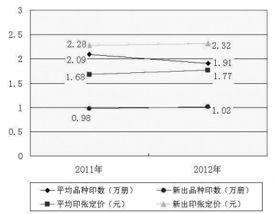 2012年,全国平均品种印数(总印数/总品种)为1.91万册,平均印张定价(定价总金额/总印张)为1.77元;新出品种平均印数为1.02万册,新出品种印张定价为2.32元。2011年,全国平均品种印数(总印数/总品种)为2.09万册,平均印张定价(定价总金额/总印张)为1.68元;新出品种平均印数为0.98万册,新出品种印张定价为2.28元(见图5)。