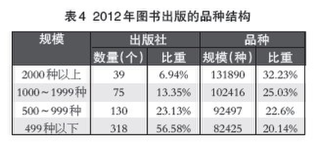 可见,2012年,图书出版品种方面出现了五二/二五现象,即全国不到二成的出版社出版了超过一半的图书品种,而超过半数的出版社出版了20%的出版品种,品种资源向大社倾斜的趋势更加明显。
