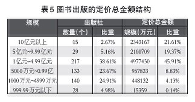 2012年,定价总金额超过20亿元的出版社4家,为高等教育出版社、北京师范大学出版社、人民教育出版社、外语教学与研究出版社。10~20亿元定价总金额的出版社有11家,分别为科学出版社、教育科学出版社、江苏教育出版社、人民卫生出版社、人民邮电出版社、机械工业出版社、延边大学出版社、清华大学出版社、湖南教育出版社、重庆出版社、四川教育出版社。5亿元以上的出版社共44家,占出版社数量的不足10%,但其生产图书的定价总金额超过全国总量的40%(见表5)。