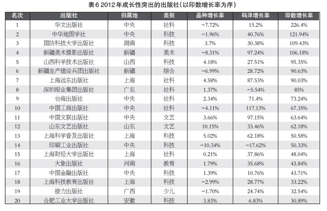 截至2012年年底,全国共有出版社580家(包括副牌社33家),共出版图书414005种,出版社平均品种规模为714种,比2011年(580家共出版图书369523种)的637种增长了12.09%。