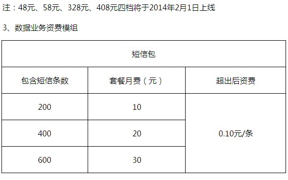 1月13日,中国移动公布了4G全网统一资费方案,该资费方案包含移动数据流量、全国长市漫一口价语音以及数据业务三种资费元素。其中移动数据流量从40元400M到280元10G共7档;全国长市漫一口价语音从48元200分钟到408元4000分钟共7档;数据业务包括短信和彩信各3档。