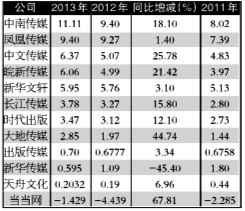 当然,跟往年的情况相似,从各家分行业情况来看,如出版、发行、报刊等主营业务的收入,并非与总体营收同步增长,位居增长和下滑前列的业务尤其是负增长的那些更要值得业内人员的关注。比如新华文轩,2013年度出版分部、发行分部、征订业务、零售、商超、互联网销售及其他分部,分别实现收益人民币18.79亿元、43.65亿元、30.34亿元、9.09亿元、1.38亿元、2.36亿元、1.63亿元(均含分部间销售),同比增长2.8%、9.7%、7.3%、62.0%、12.6%、28.8%、580.5%。但当中发行分部、征订业务、零售业务、互联网销售的毛利率分别下降了1.0个百分点、1.0个百分点、1.2个百分点、1.6个百分点。