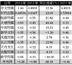 表3抛开减亏的当当网,净利润绝对值的排名座次倒与2012年变化较大,其一是中文传媒和皖新传媒双双超越新华文轩,其二是新华传媒净利润下降幅度加大,落后于出版传媒。而从净利润同比增长幅度来看,位居前列的则是大地传媒、中文传媒、皖新传媒、中南传媒、长江传媒。同样的,表4的数据表明,皖新传媒、大地传媒、中南传媒均赶超了新华文轩,而大地传媒还赶超了中南传媒。从每股收益的增长幅度来看,则与净利润的增长情况大致相符,排在前面的还是那5家,只是中文传媒换到了第5名,之前依次是大地传媒、皖新传媒、中南传媒、长江传媒。从年报透露来看,大地传媒增幅较快,受前其围绕“上规模、调结构、促转型、树品牌”总体发展战略目标,面对复杂的政策环境和多变的市场形势,不失时机的开展资本运作,全力推进公司重大资产重组工作,加速推进资源整合,进一步优化了资产结构。而新华传媒因重点行业和重要客户对平面媒体的广告预算有所减少,导致广告业务同比下降,加上实体书店人流量和客单价略有下降,所以净利润与每股收益有较大幅度地负增长。