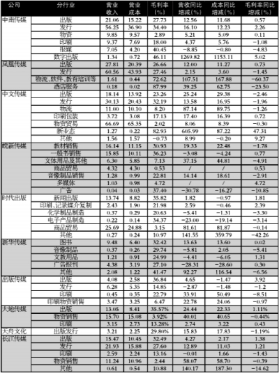 从表5也可以看出,营业收入负增长的有中南传媒的报媒业务(-8.85%)、皖新传媒的一般书销售(-3.08%)和广告业务(-30.78%)、时代出版的化学制品制造(-5.41%)和电子制品制造(-23.00%)、新华传媒的音像制品(-5.81%)、文教用品(-4.41%)和广告报刊(-28.31%),出版传媒的发行业务(-2.87%),长江传媒的印刷业务(-0.01%);而毛利率负增长的更多,中南传媒的印刷(-1.08%)和报媒(-4.83%),凤凰传媒的发行(-1.45%)、物流等(-60.37%)和酒店服务(-23.50%),中文传媒的出版(-2.46%)、发行(-1.96%)、物流(-1.26%)、物资贸易(-0.30%),皖新传媒的教材销售(-1.78%)、文体用品(-4.91%)、音像制品销售(-2.91%)和广告(-10.85%),时代出版的化学制品制造(-3.30%)、电子产品制造(-3.14%)、商品贸易(-0.14%)和其他(-42.26%),新华传媒的音像制品(-5.41%)和其他业务(-6.56%),出版传媒的发行(-1.20%)、印刷(-8.51%)和印刷物资销售(-0.97%),大地传媒的物资销售(-0.44%),天舟文化的出版发行(-1.19%),长江传媒的印刷(-1.43%)、物资销售(-0.39%)和其他(-14.62%)。据统计,在各家出版发行主营业务单列项中,毛利率增长的仅占20项,下滑的占27项,当中下降幅度超10%的也有5项,无不值得警示。