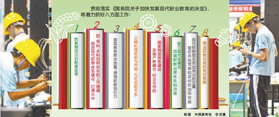 《决定》提出了今后一个时期加快发展现代职业教育的指导思想和政策措施,鲁昕指出,《决定》的创新点主要有六个方面: