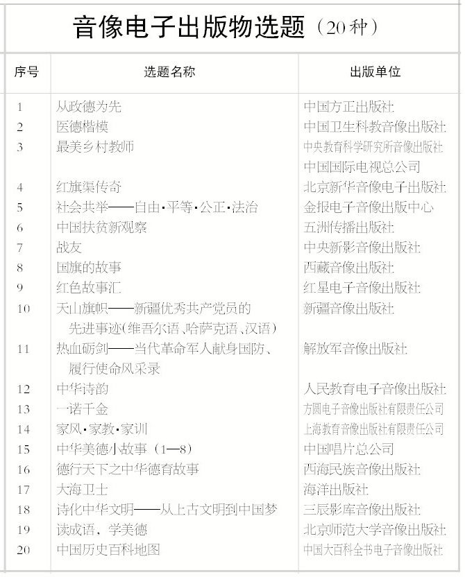 培育和践行社会主义核心价值观主题出版重点选题 (音像电子出版物选题20种)