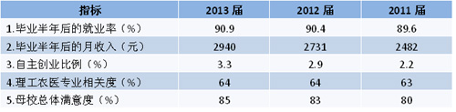 报告显示,毕业生就业率持续上升,2013届毕业生半年后的就业率为90.9%,比2012届上升0.5个百分点。月收入持续增长,“跑赢”通货膨胀,2013届毕业生半年后月收入为2940元,比2012届增长7.7%。自主创业比例为3.3%,比两年前的2.2%提高了50%。毕业生专业相关度为64%,与前两年基本持平。毕业生对母校的满意度持续上升,2013届的满意度为85%,比2012届上升2个百分点。(见表1)