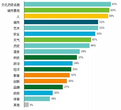 该调查的初衷,就是探寻人们对国家吸引力的因素的看法。调查显示,其中较为重要的因素包括国家的文化历史名胜、城市景观、人,选择这三个因素的受访者分别占比61%、60%、59%。