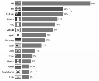 全世界最具吸引力国家有哪些呢?报告对影响国家吸引力的要素、文化对国家吸引力的作用等进行调查研究后,最后进行了对世界上最具吸引力国家的调查。受访者从世界上最大的15个国家中选择三个他们认为最具吸引力的国家。结果显示,美国排名第一,英国、澳大利亚并列第二。60%的受访者选择了美国,使其在排行榜上遥遥领先于英国和澳大利亚(36%)。之后,依次是法国(31%)、意大利(29%)、加拿大(27%)、日本(21%)、德国(20%)、西班牙(17%)、巴西(11%)、中国(9%)、墨西哥(8%),俄罗斯、韩国和印度均被6%的受访者选中。(见图2)