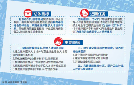 《意见》提出,到2020年,基本建成院校教育、毕业后教育、继续教育三阶段有机衔接的具有中国特色的标准化、规范化临床医学人才培养体系。院校教育质量显著提高,毕业后教育得到普及,继续教育实现全覆盖。近期任务是要加快构建以“5+3”(5年临床医学本科教育+3年住院医师规范化培训或3年临床医学硕士专业学位研究生教育)为主体、以“3+2”(3年临床医学专科教育+2年助理全科医生培训)为补充的临床医学人才培养体系。