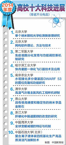 由教育部科学技术委员会组织评选的2014年度“中国高等学校十大科技进展”,日前在京揭晓。经过形式审查、学部初评、主任办公(扩大)会终评和项目公示,北京大学主持的单个纳米颗粒光学检测新原理研究等10个高校科技项目,获评本年度高校科技十大进展。