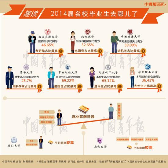 近日,教育部75所直属高校陆续发布了2014届高校毕业生就业质量年度报告(以下称“年报”)。中国青年报记者通过统计发现了一些有趣的结论:学校所在地成大学生就业首选城市;国有企业仍占主流,但民营企业势头已起来;学生干部和专业成绩好都可能成为获得高薪的要素。