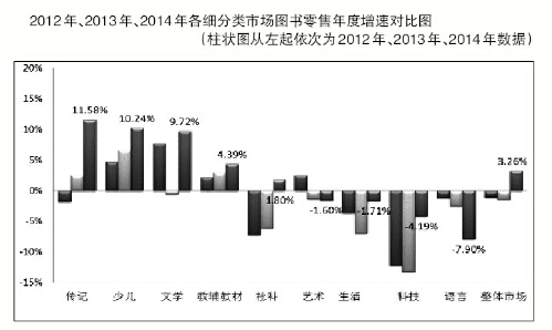 对于中国图书零售市场来说,2014年是值得业内人士欣喜的一年。根据北京开卷信息技术有限公司“开卷全国图书零售市场观测系统”对全国绝大多数大中型书店的监测数据显示,2014年实体书店图书零售市场一改前两年负增长的态势,实现了3.26%的正增长;网上书店销售继续保持高速增长,出版发行机构对线上零售的重视程度和投入力度也在增强;线上与线下两个渠道中,全国图书零售市场实现了10%左右的增长率,在全球出版业中属于高速发展的国家。