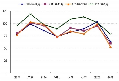 2015年1月,整体市场指数为95.7点,较上月上升了18.7点,环比升幅为24.29%。在各细分市场中,文学类位列首位,指数值为118.7;艺术类列次席,指数值为113.3;少儿类和生活类分列第三、四位,指数值分别为108.6和101.7。社科类、科技类和教育类的指数值低于100,分别为97.8、89.1和78.3。与上月相比,艺术类、生活类和少儿类超过上月榜首文学类,其余位次顺延。