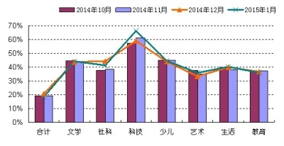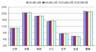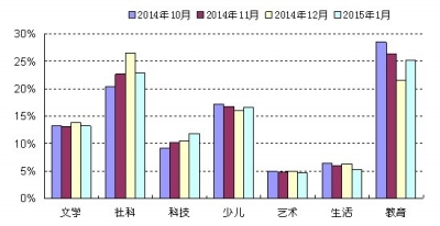 从各细分市场集中度的环比增减来看,科技类、艺术类、少儿类、文学类和生活类五类上升,其中科技类上升较多,上升了7.53个百分点;社科类和教育类两类下降,分别下降了2.94和0.62个百分点。从各细分市场的市场集中度在近4个月的表现比较来看,科技类和生活类在1月的市场集中度为近4个月来最高,科技类较最低时的10月高出了9.03个百分点,生活类较最低时的2014年11月高出了2.30个百分点;教育类则为近4个月来最低,较最高时的2014年11月低1.21个百分点。