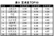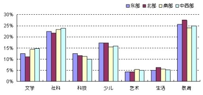 从各区域间的细分市场份额比较来看,文学类和社科类在中西部市场的码洋份额高于其他各区域;教育类、少儿类和生活类在北部市场的码洋份额在四区域中领先;东部市场中科技类较有优势,南部市场中则是艺术类表现较为突出。相对而言,东部市场在艺术类和生活类,北部市场在文学类和社科类,南部市场在少儿类和教育类,以及中西部市场在科技类的市场表现则较为不尽人意,上述几类图书在相应区域的码洋份额较其他区域市场为低。