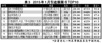 在引进版图书的来源地方面,前10名图书中,源自中国台湾、日本和美国的图书品种最多,各有2本入榜,哥伦比亚、巴基斯坦、英国和法国各有1本入围。在出版社方面,TOP10引进版图书中南海出版公司有3本入榜,生活·读书·新知三联书店、上海人民出版社、浙江人民出版社、重庆出版社、广西师大出版社、外研社和湖南文艺出版社各有1本图书入榜。在图书类别方面,文学类、社科类、教育类、少儿类和科技类分别有6本、2本、1本和1本入榜。在出版时间方面,2014年、2013年和2012年出版的引进版图书各有3本、1本和2本入围,2011年及以前出版的图书则有4本。在本次的引进版榜单中,较为引人注目的是三联书店版《孩子你慢慢来》,监测销量为8733册,环比增加8351册,在整体市场飙升榜中也位列三甲。