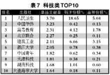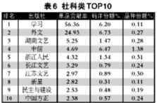 2015年1月的整体市场集中度CR10为18.27%,较上月下降了2.36个百分点,较前月(去年11月)下降了0.90个百分点,较再前月(去年10月)下降了0.85个百分点,为近4个月中最低。在各细分市场中,科技类的市场集中度高出其他各类较多,该类市场前十出版社的码洋份额之和为66.30%,是各类中唯一一类集中度超过六成的类别。其他各类的市场集中度均低于50%,少儿类、文学类、社科类和生活类的集中度在40%~50%之间,分别为44.44%、44.22%、41.26%和40.28%;教育类和艺术类的集中度在30%~40%之间,分别为35.94%和35.84%。