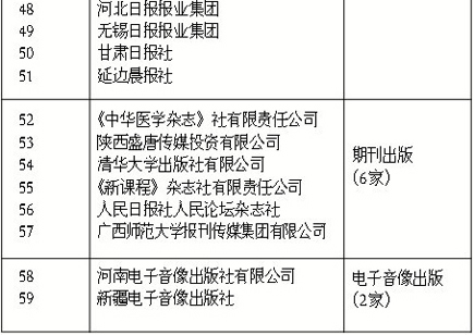 国家新闻出版广电总局日前公布了列入国家数字复合出版系统工程应用试点单位名单,人民交通出版社股份有限公司等59家新闻出版单位入选。