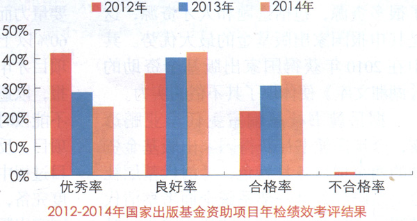 从基金资助项目年检绩效考评结果看,被评为不合格的项目逐年减少。最新一年的绩效考评结果显示,2014年没有项目考评结果不合格,这说明国家出版基金资助项目质量水平有所提升。不过,近年来国家出版基金资助项目的年检考评优秀率旱现下降趋势,而良好率和合格率在考评中所占比例逐年上升。由此看来,我国出版业在精细化出版方面的水平还有待提升,未来,国家出版基金在评选资助项目时将会更加注重出版物的质量水平,从而推动更多精品力作的出版,促进我国出版业向前发展。