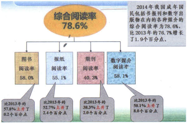 (一)2014年我国成年网民图书阅读率为58.0%,较2013年的57.8上升了0.2个百分点。数字阅读方式的接触率为58.1%,较2013年的50.1%上升了8.0个百分点。各媒介综合阅读率为78.6%,较2013年的76.7%上升了1.9个百分点。