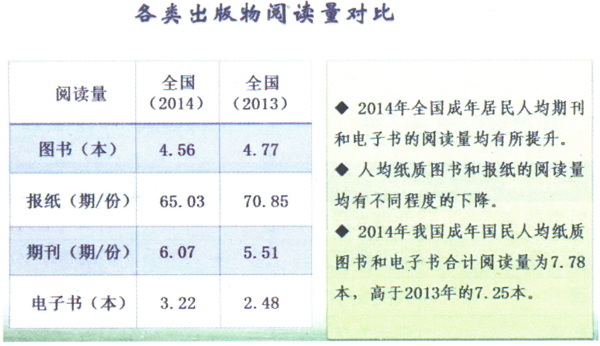 2014年我围成年国民人均纸质图书的阅读量为4.56本,与2013年的4.77本相比,减少了0.21本。人均阅读报纸和期刊分别为65.03期(份)和6.07期(份)。与2013年相比,人均报纸阅读量下降了5.82期(份),期刊的人均阅读量增加了0.56期(份)。