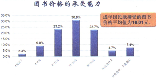 对于一本200页左右的文学类简装书的价格,有23.2%的国民能够接受8—12元的价格,有30.8%的国民能够接受12—20元的价格;11.3%能够接受8元以下,27.4%能够接受20元以上,另有7.4%的国民认为只要喜欢多贵都买。我国国民能够接受一本200页左右的文学类简装书的平均价格为16.01元,比2013年的13.68元增加了2.33元。