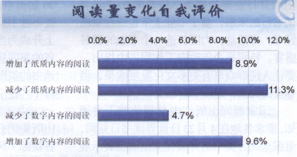 从成年国民对个人纸质阅读内容和数字阅读内容的阅读量变化情况的反馈来看,有8.9%的国民表示2014年“增加了纸质内容的阅读”,但有11.3%的国民表示2014年“减少了纸质内容的阅读”;有4.7%的国民表示2014年“减少了数字内容的阅读”,但有9.6%的国民表示2014年“增加了数字内容的阅读”。